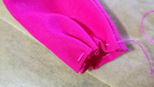 Amikor összevarrtuk a végén nem vágjuk el a cérnát, hanem nagy öltésekkel körbevarrjuk,hogy összetudjuk húzni a tulipán alját.