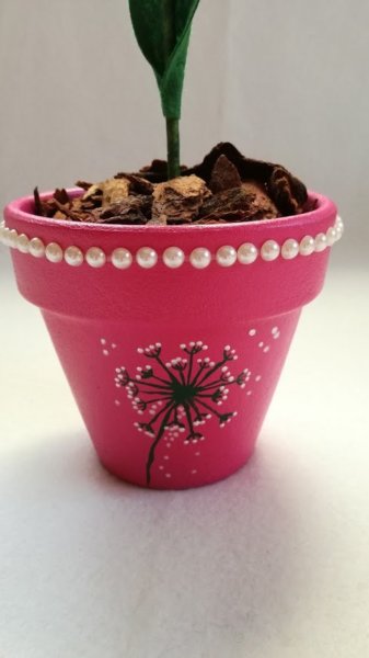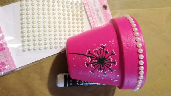 A cserepet ha már megszáradt még egyszer lelakkozzuk és megszárítjuk hajszárítóval. A dekorációs öntapadós gyöngyöket felragasszuk a cserép szélére.