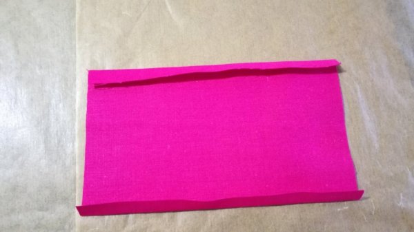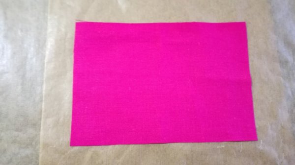Kimérjük és kivágjuk a 11x16cm-es anyag darabot a tulipánhoz, majd a kettő hosszabbik oldalán 1-1 cm-ert behajtunk és levasaljuk az anyagunkhoz megfelelő hőfokú vasalóval, úgy a hogy a képen látjátok.