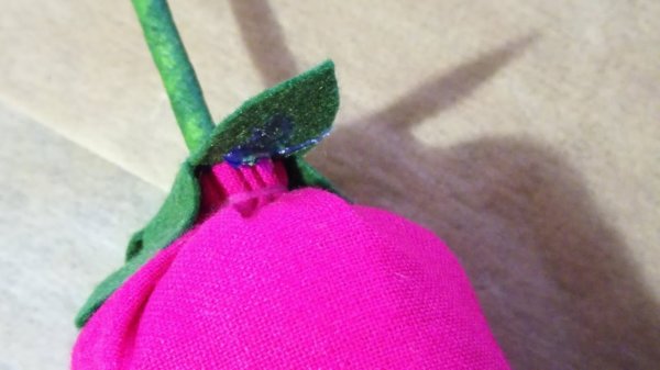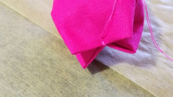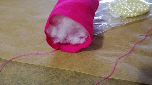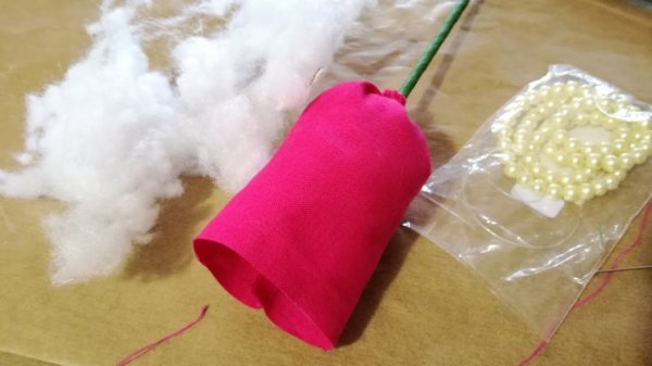 Megtöltjük a tulipán belsejét töltő anyaggal és a levasalt szélét visszahajtjuk, megkeressük a virág közepét és kicsi öltésekkel összerögzítjük a kép szerint.
