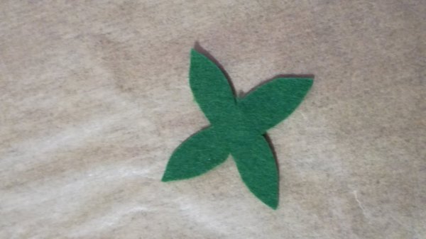 A zöld filcből vágjunk ki egy 4,5×4,5 cm-es kockát. ebből készítsük el a csészelevelet. Ha bizonytalanok vagytok, akkor először papírból vágjátok ki és azt tűzzétek a filcre és úgy vágjátok körbe.