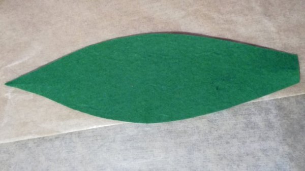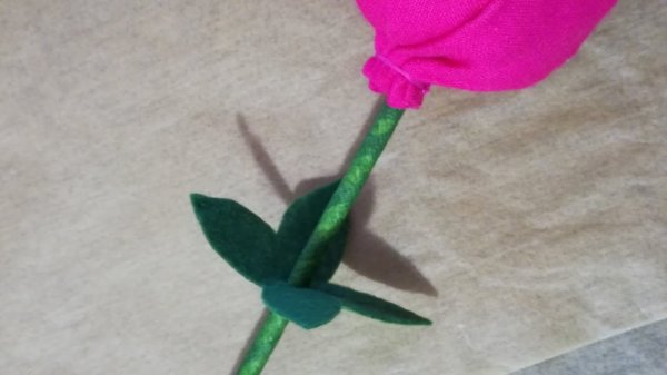 A levélnek kiszabunk egy 18x7cm-es zöld filc anyagot amit levél formára kivágunk de úgy,hogy az a rész amit a pálcához rögzítünk szélesebb legyen. Hozzá mérjük a virághoz, megnézzük hová esik a levél ragasztása a száron,beragasztózzuk az levél alsó felét és a pálcához ragasszuk. Készen van a tulipánunk.