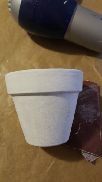 A cserepet áttörölgetjük és a csiszoló vászonnal átcsiszoljuk, eltávolítva az előző felületet vagy a kisebb szennyeződéseket. Az alapozó festékkel lefestjük, mert az alapozóra jobban tapad a festék és elfedi az előző nemkívánatos hibákat. Az alapozót megszárítjuk a hajszárítóval.