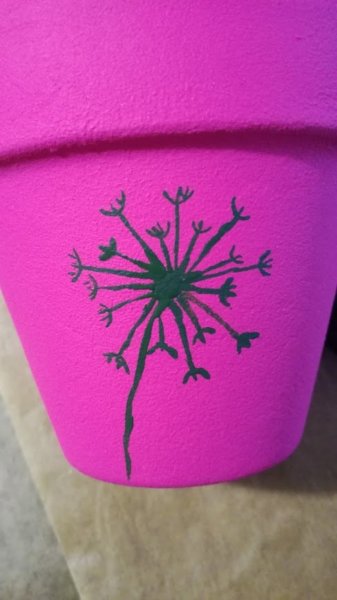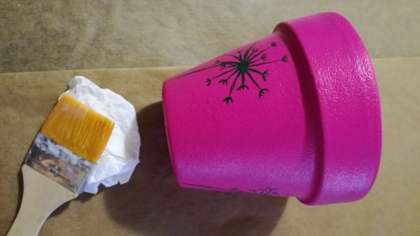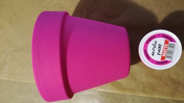 Magenta színű festékkel lefestjük. Én magentával készítettem, mert rózsaszínű anyag darabom volt itthon. Ti olyanra színezzétek a cserepet ami passzol színben ahhoz az anyaghoz amit a tulipánra szeretnétek felhasználni. Aztán hajszárítóval megszárítjuk a réteget.