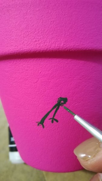 A zöld színnel a vékony ecset segítségével megrajzoltam a virág alapját. (nézzétek meg milyenre készítettem és az alapján csináljátok meg! Nem nehéz..higgyétek el menni fog! 3db -ot rajzoltam a cserépre, ennyi fért ki a hely miatt. Óvatosan dolgozzatok, nehogy az előző minta elmaszotolódjon. Ha nem vagytok biztosak, hogy nem nyúltok a mintába akkor egyenként szárítsátok meg hajszárítóval és csak száradás után kezdjetek a következőbe.
